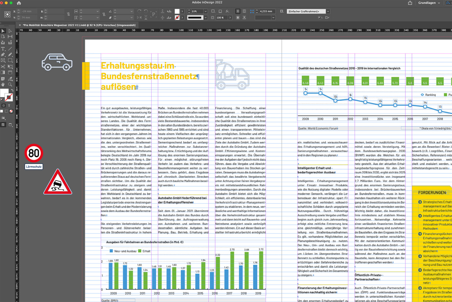 cagefish gestaltete für Pro Mobility eine 28-seitige Broschüre im A4-Format. Der Leitfaden 2025 hilft Pro Mobility dabei, konkrete Handlungsempfehlungen für die 20. Legislaturperiode des Deutschen Bundestages zu kommunizieren. Für Pro Mobility ist klar: Ohne Straßen geht es nicht!